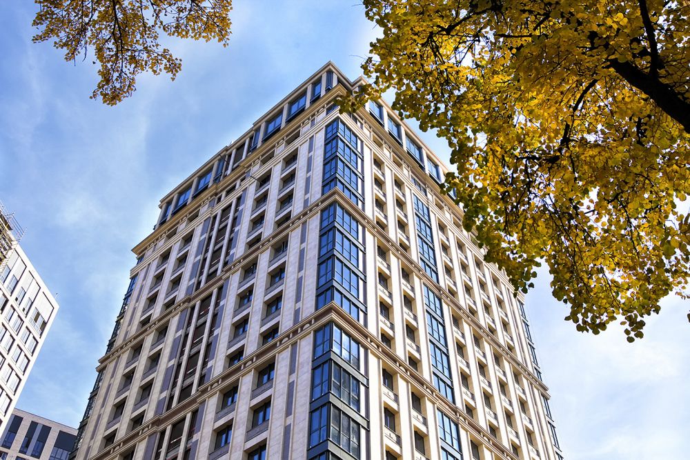 Облицовочный материал: керамогранит (скрытое крепление), декор из стеклофибробетона