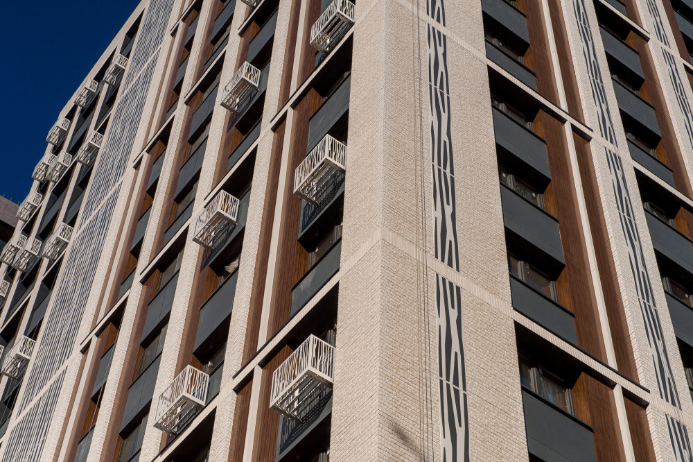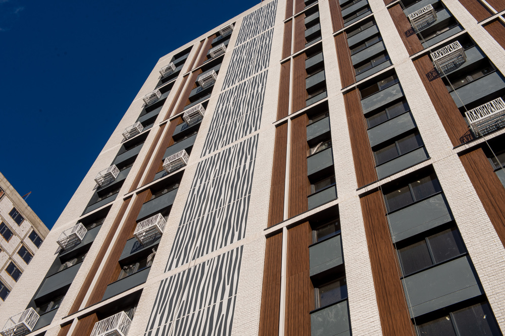 Облицовочный материал: Rockpanel, стальной листовой композит, керамогранит (скрытое крепление), декоративный камень White Hills