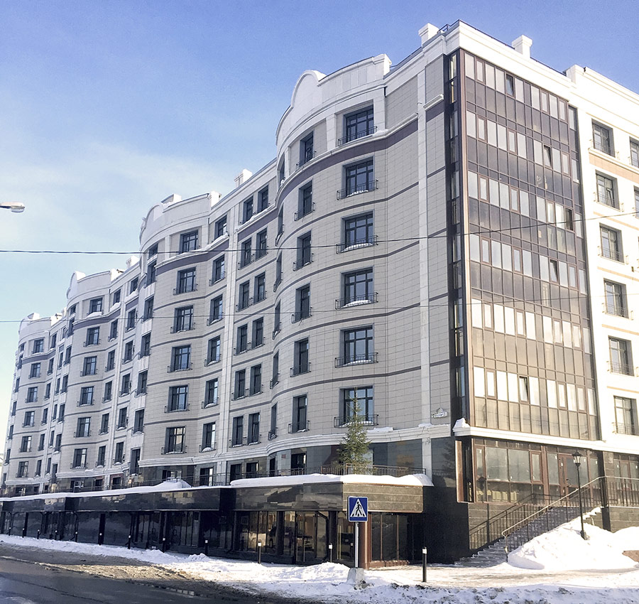 Облицовочный материал: керамогранит (скрытое крепление), натуральный камень, декор из стеклофибробетона