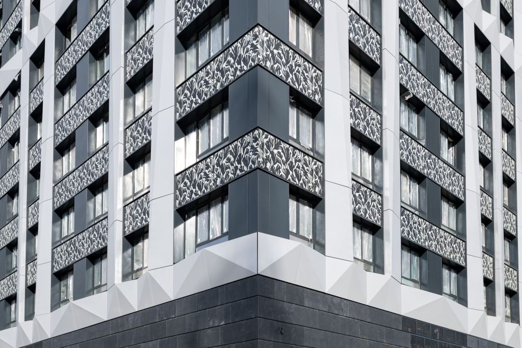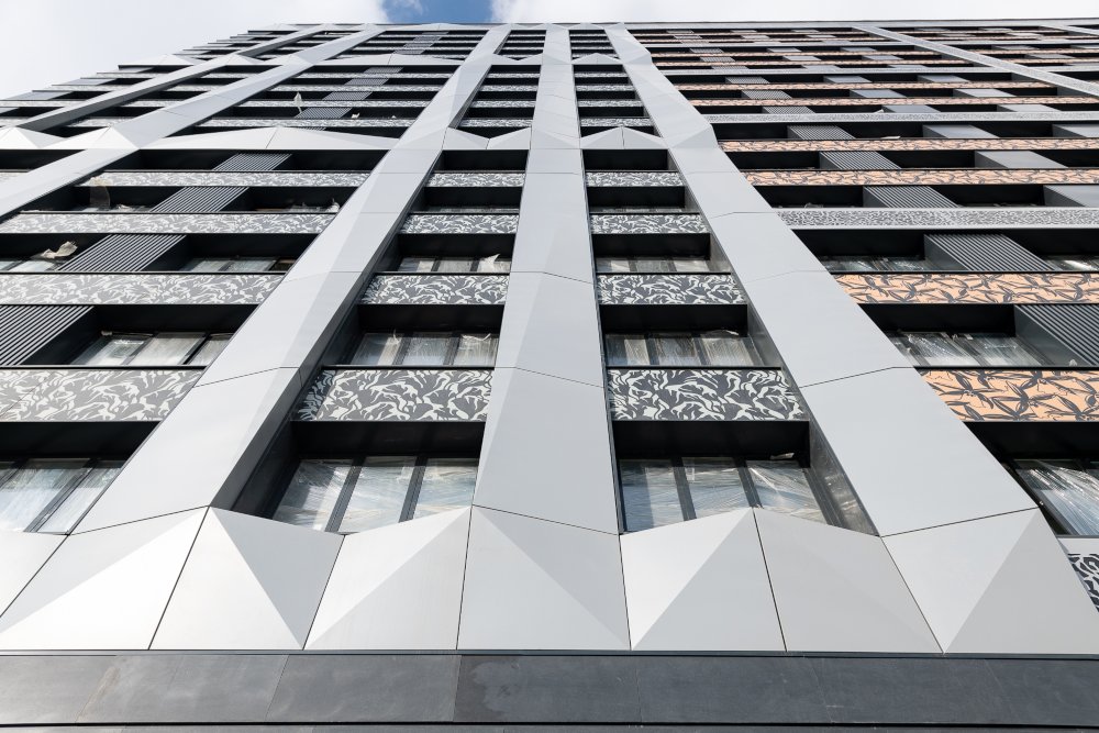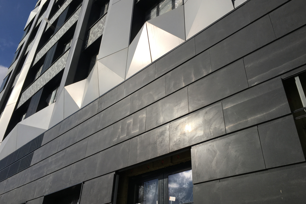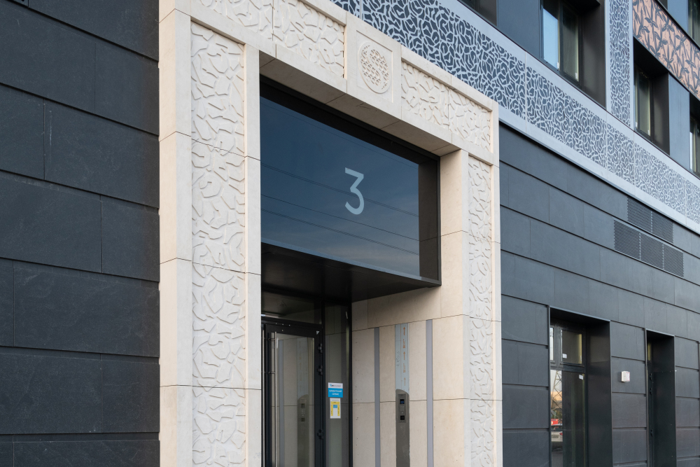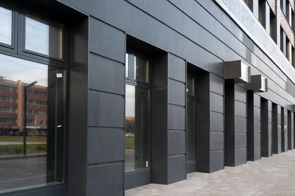 Облицовочный материал: металлокассеты, керамогранит (скрытое крепление), натуральный камень с рустами