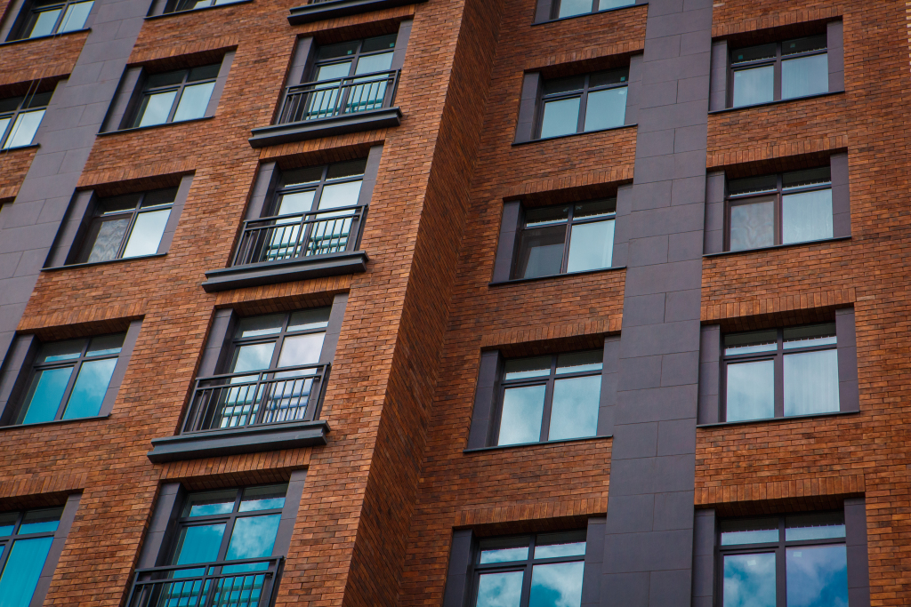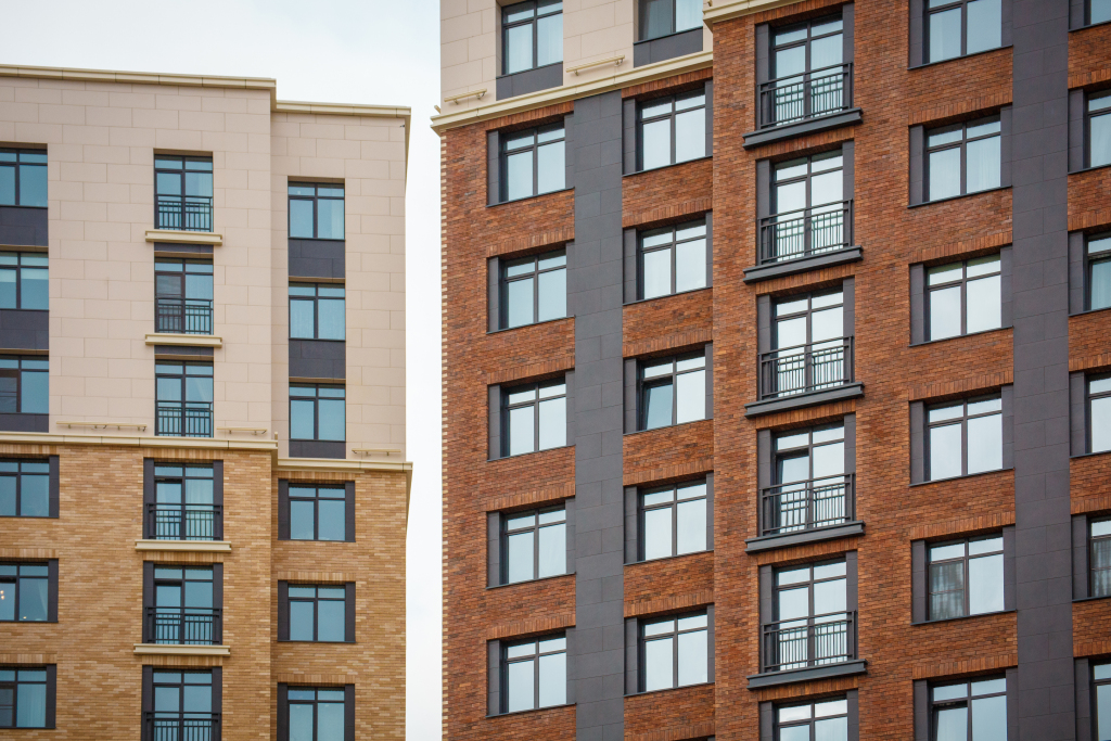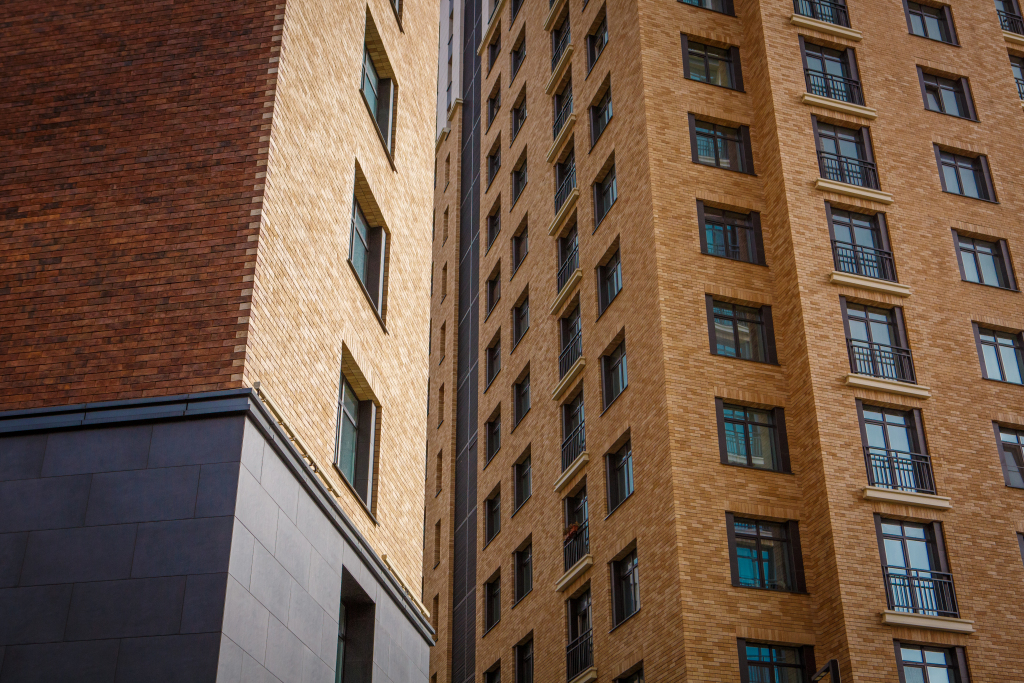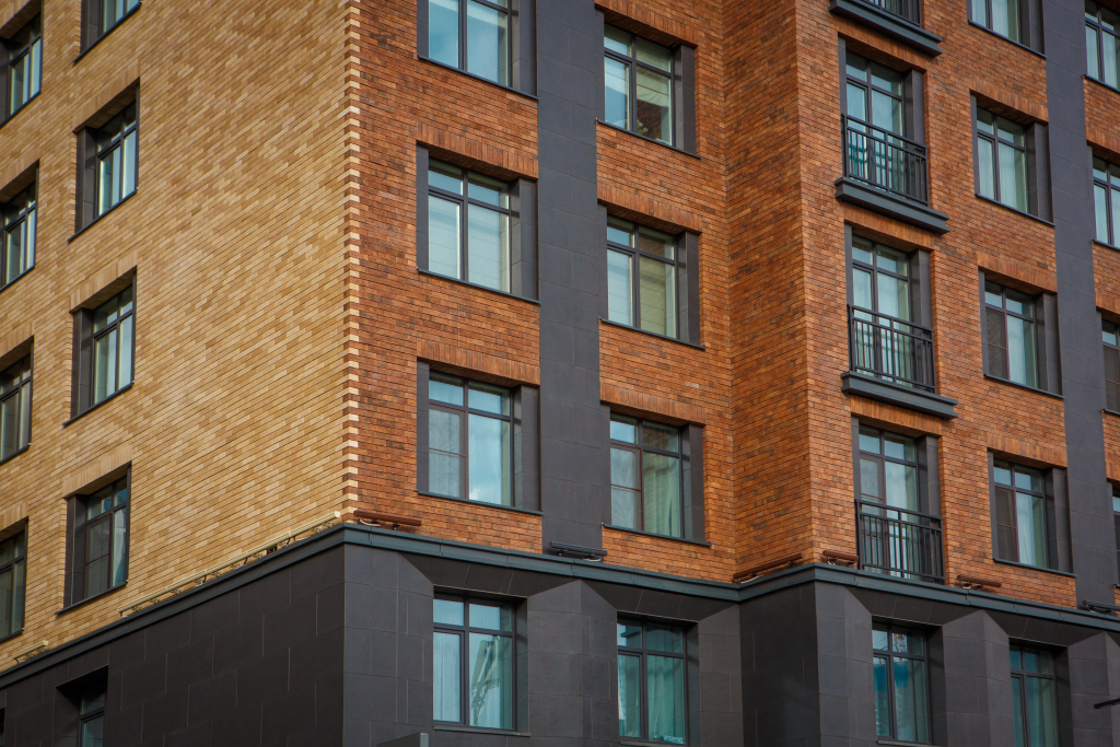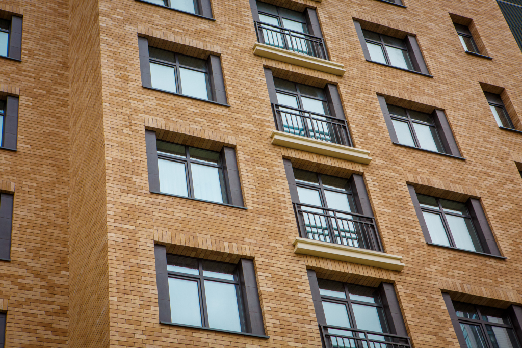 Облицовочный материал: керамогранит (скрытое крепление), декоративный камень White Hills