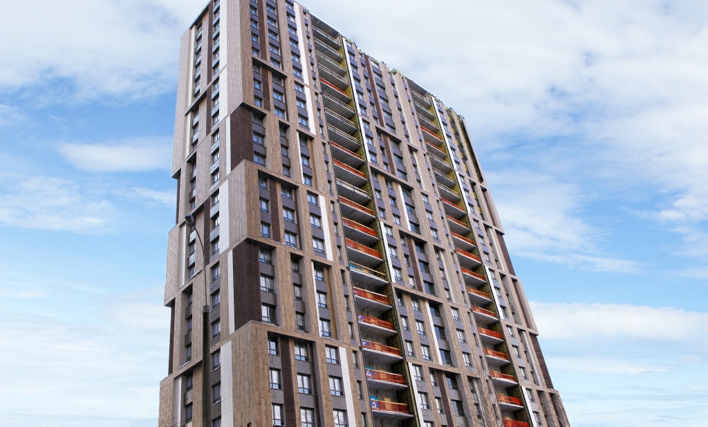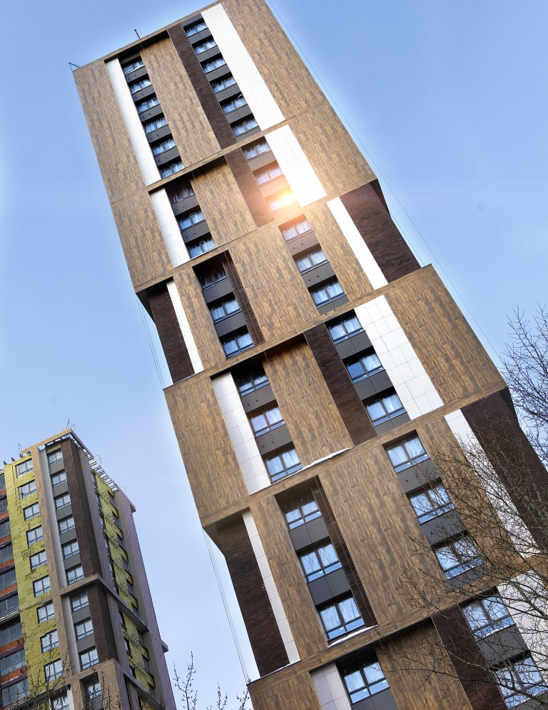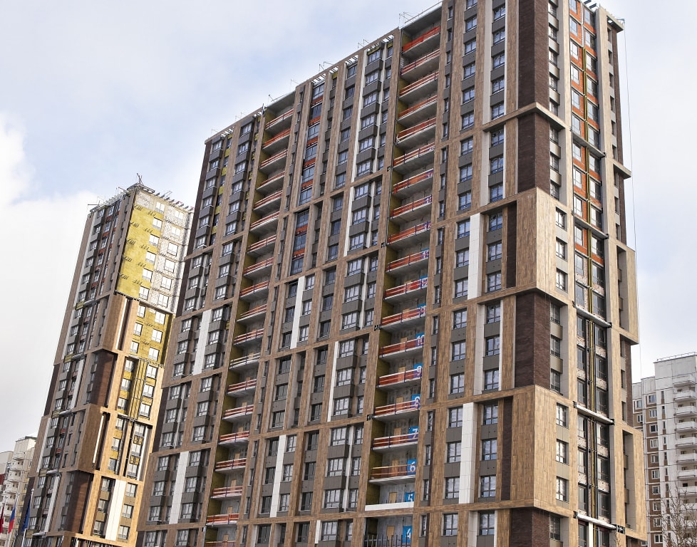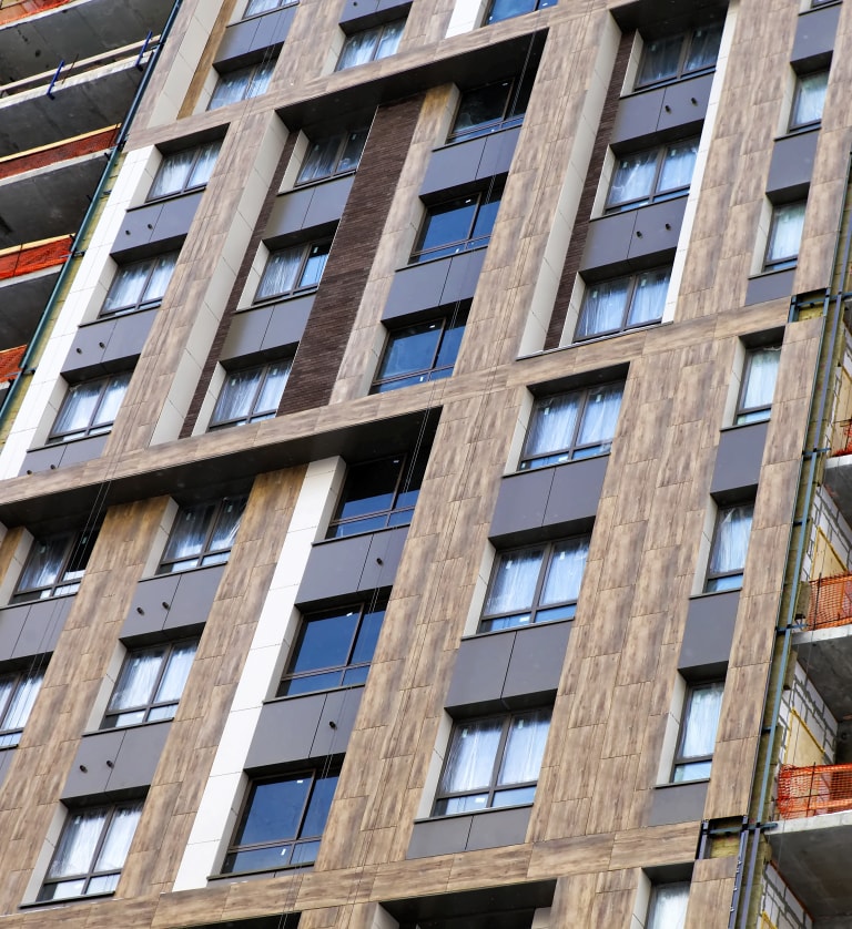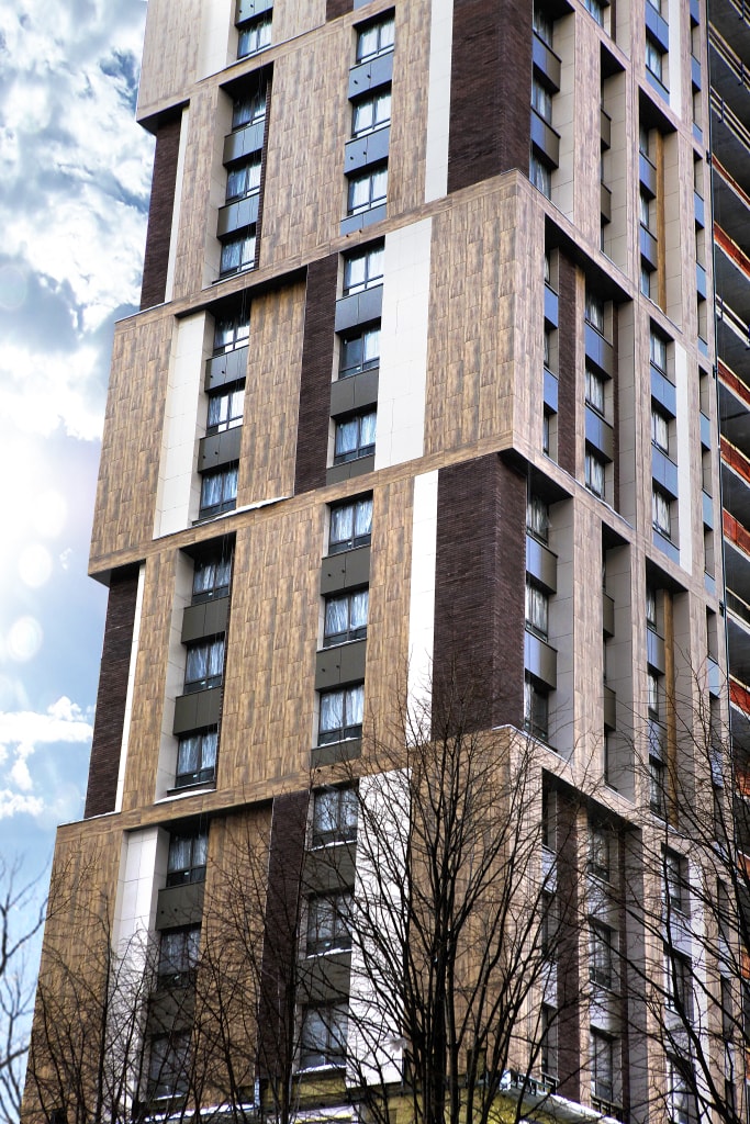 Облицовочный материал: керамогранит (скрытое крепление), декоративный камень White Hills