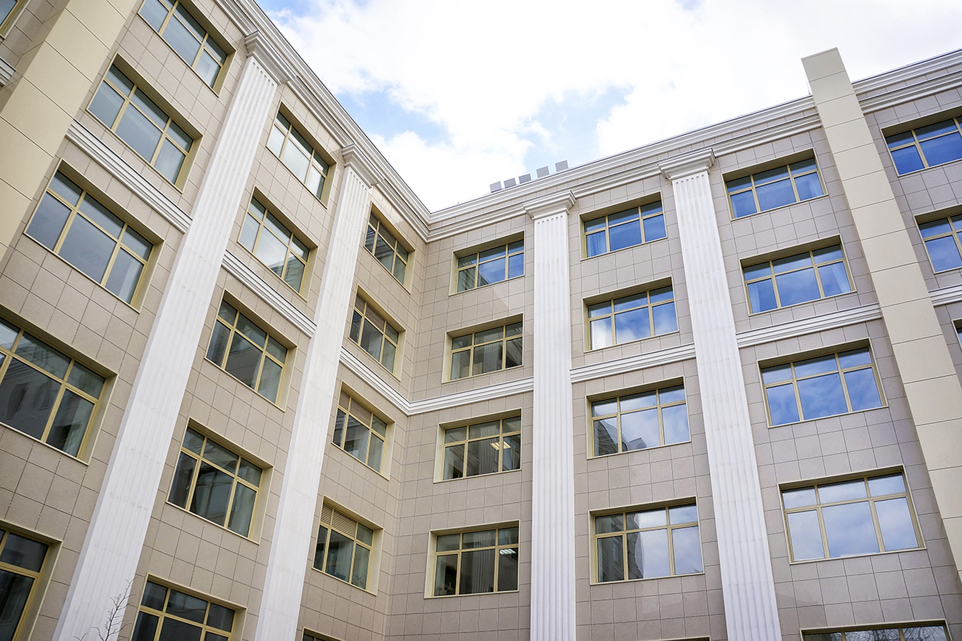 Облицовочный материал: керамогранит (видимое крепление), декор из стеклофибробетона