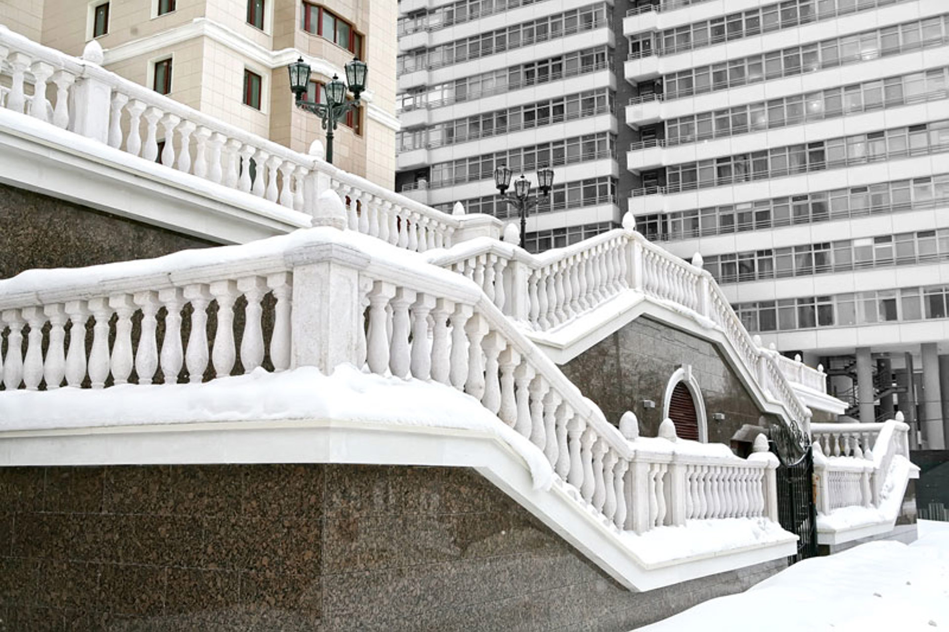 Облицовочный материал: керамогранит (видимое крепление), натуральный камень, декор из стеклофибробетона