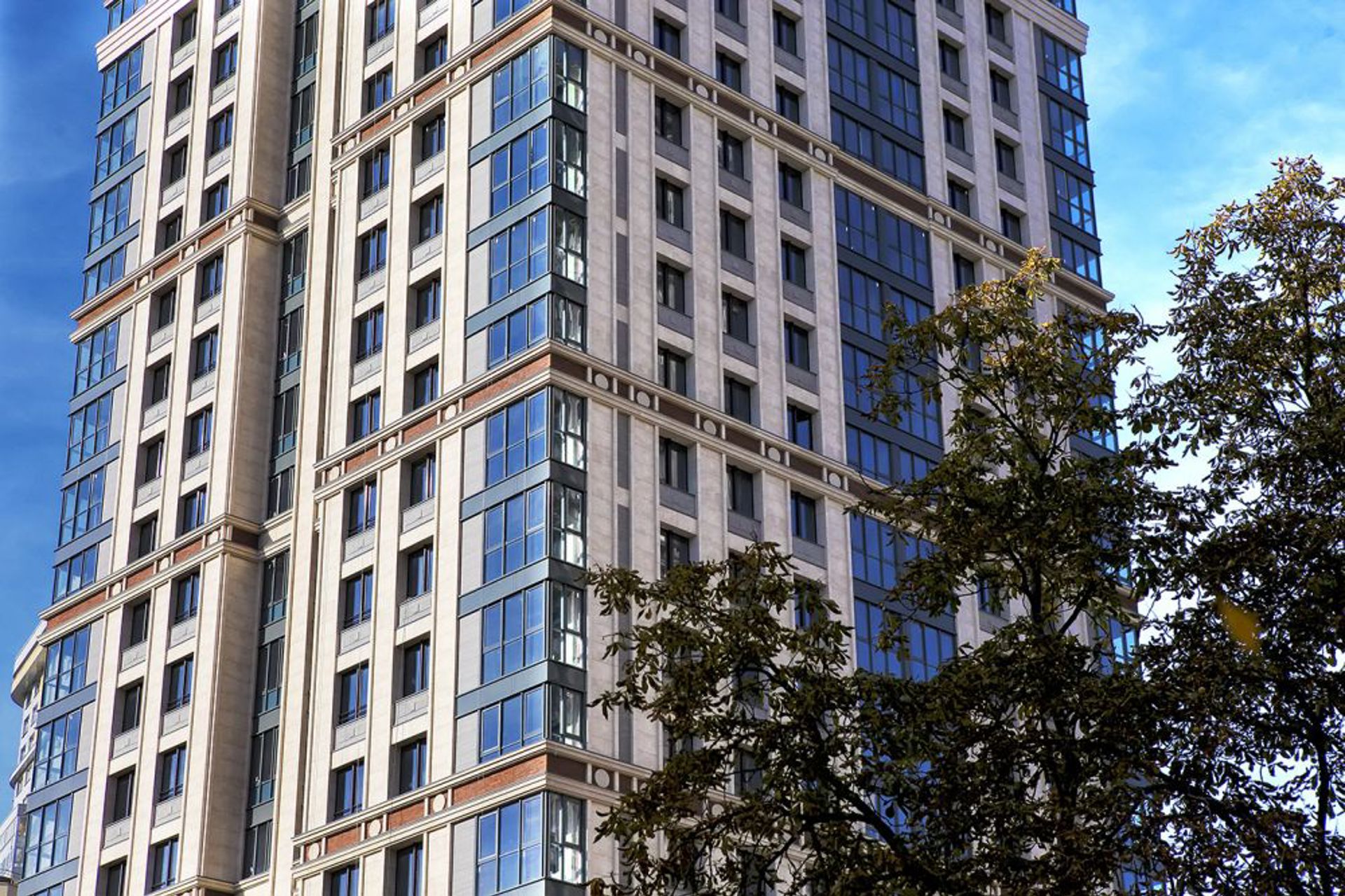 Облицовочный материал: керамогранит (скрытое крепление), стеклофибробетон