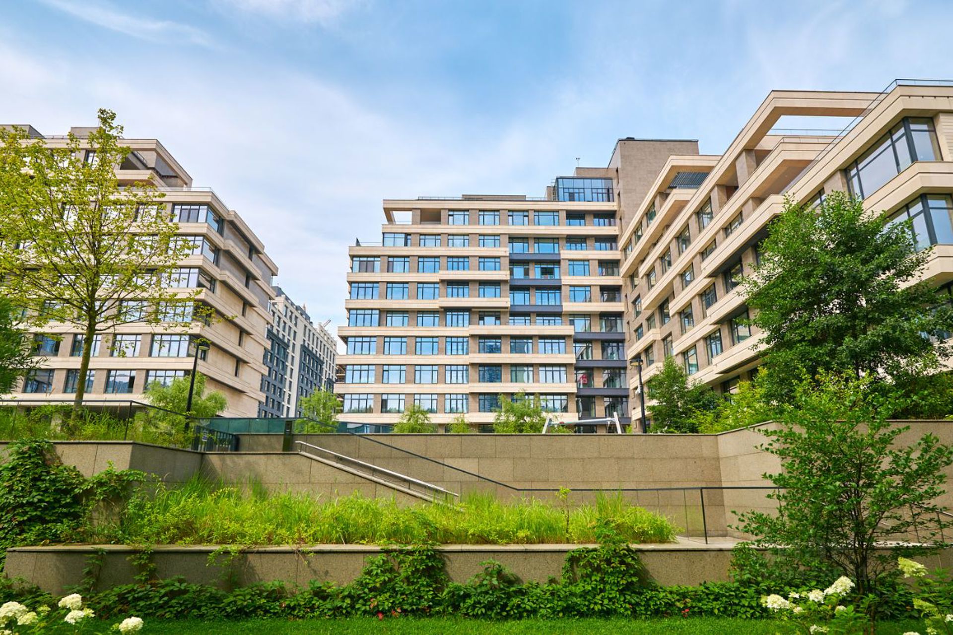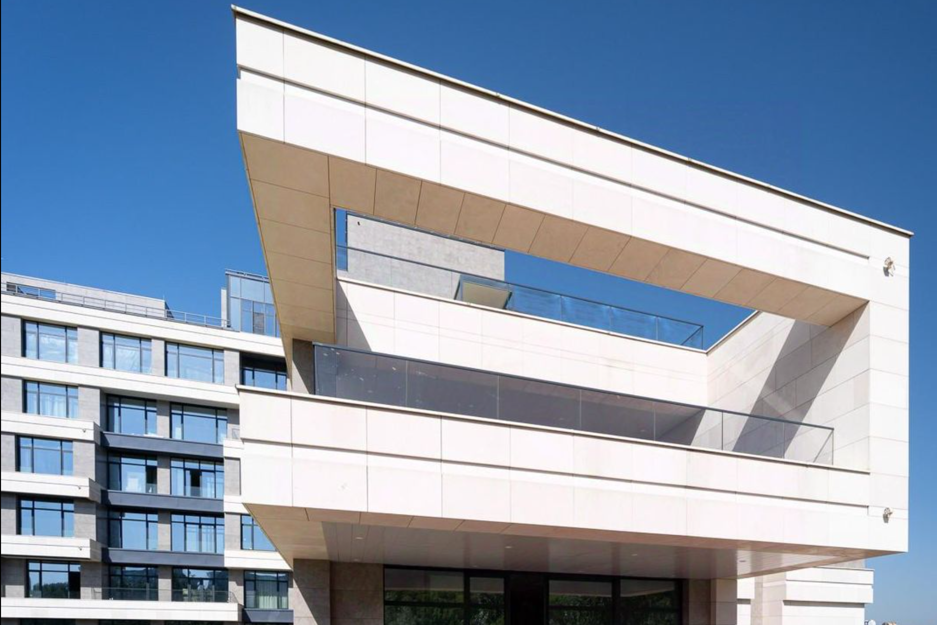 Облицовочный материал: кассеты из алюмокомпозита, крупноформатный натуральный камень, крупноформатный керамогранит (скрытое крепление)