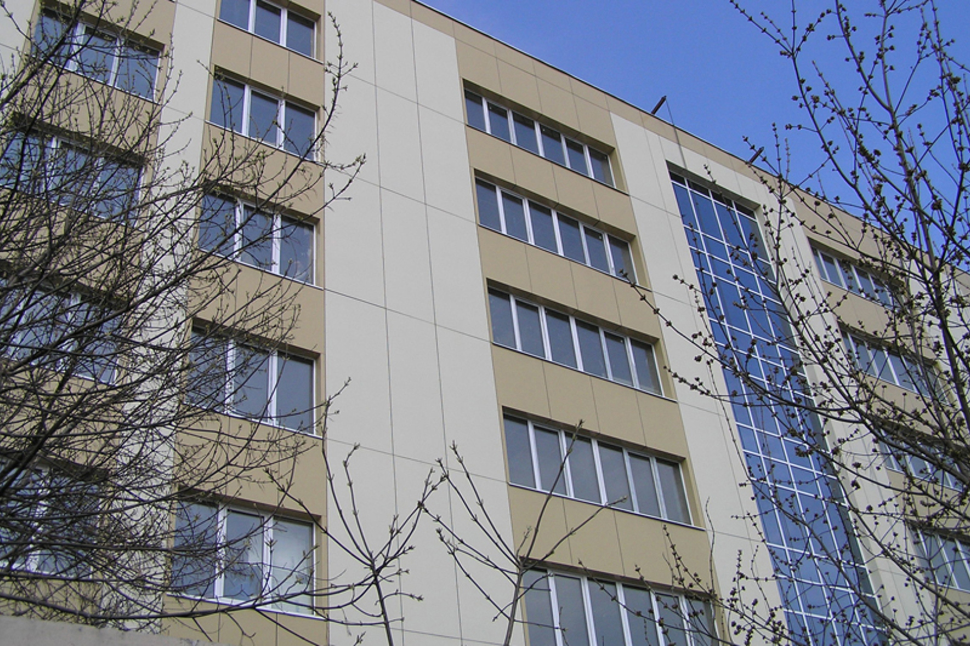 Облицовочный материал: кассеты из композитных материалов, керамогранит (видимое крепление), витражи