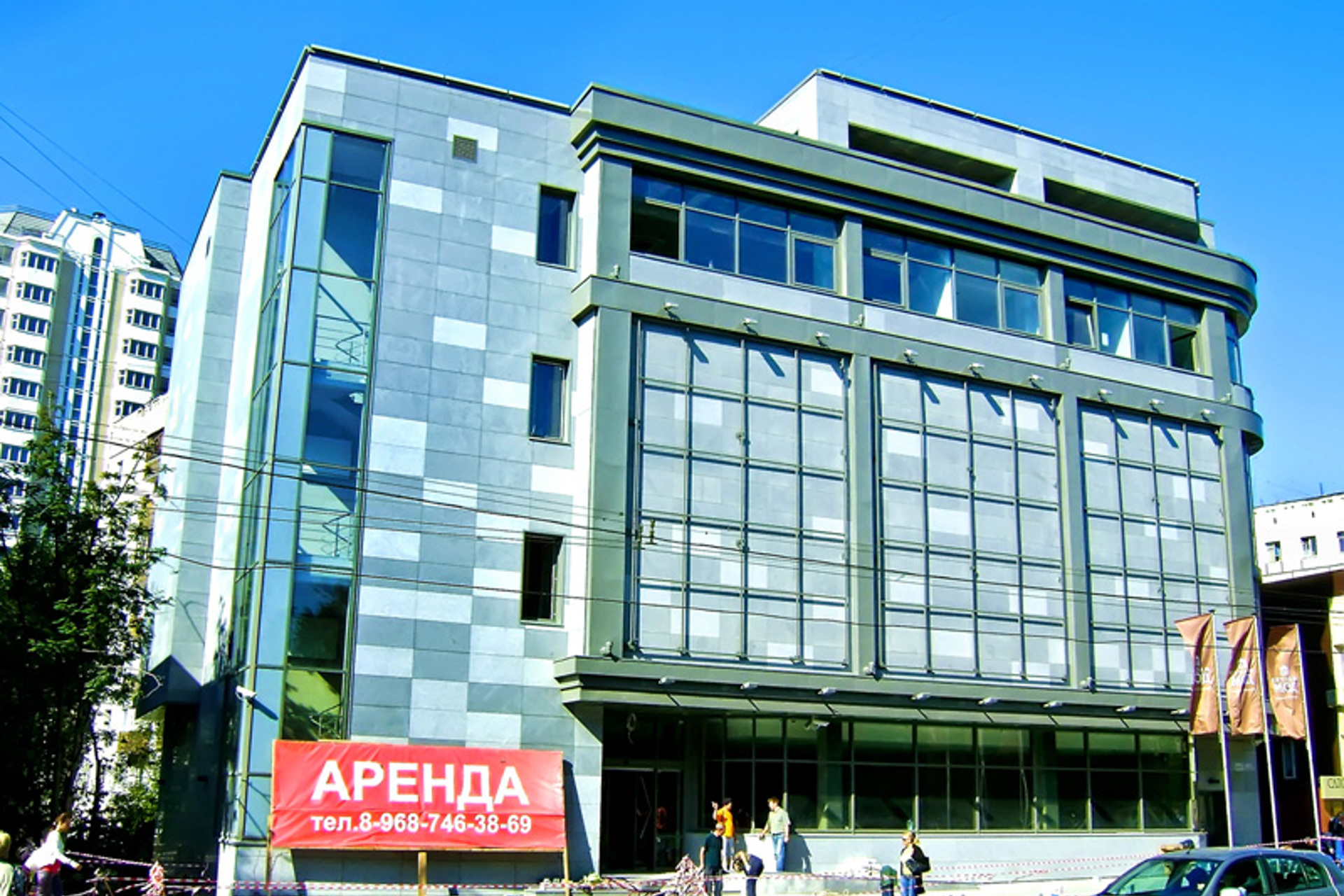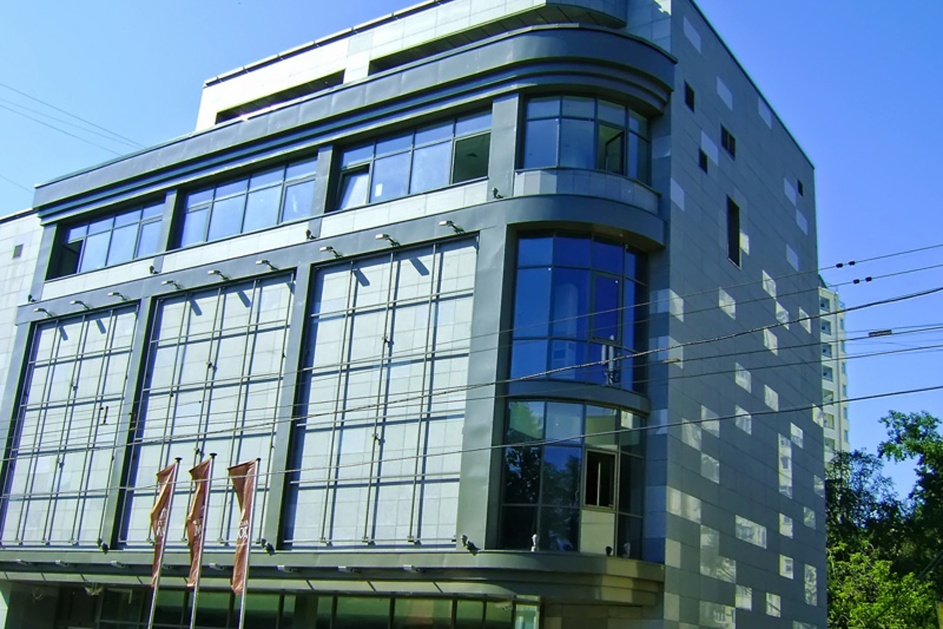 Облицовочный материал: кассеты из алюмокомпозита, натуральный камень