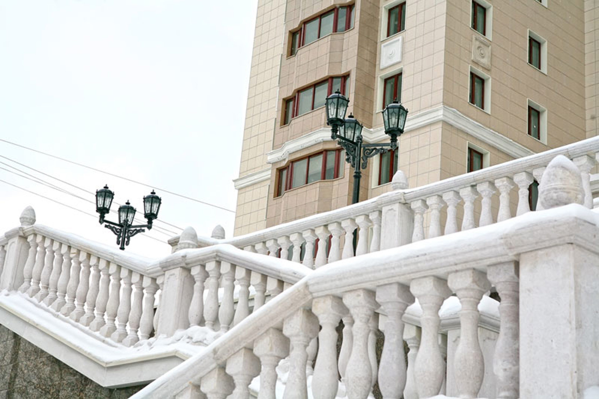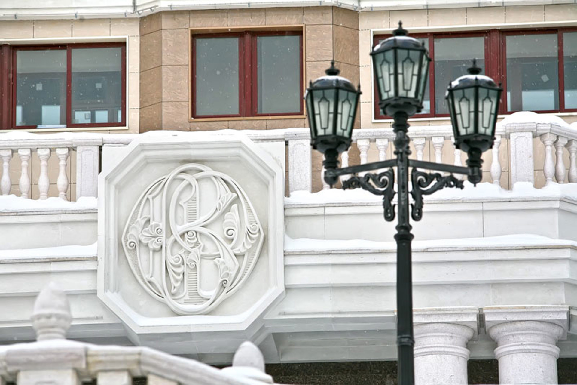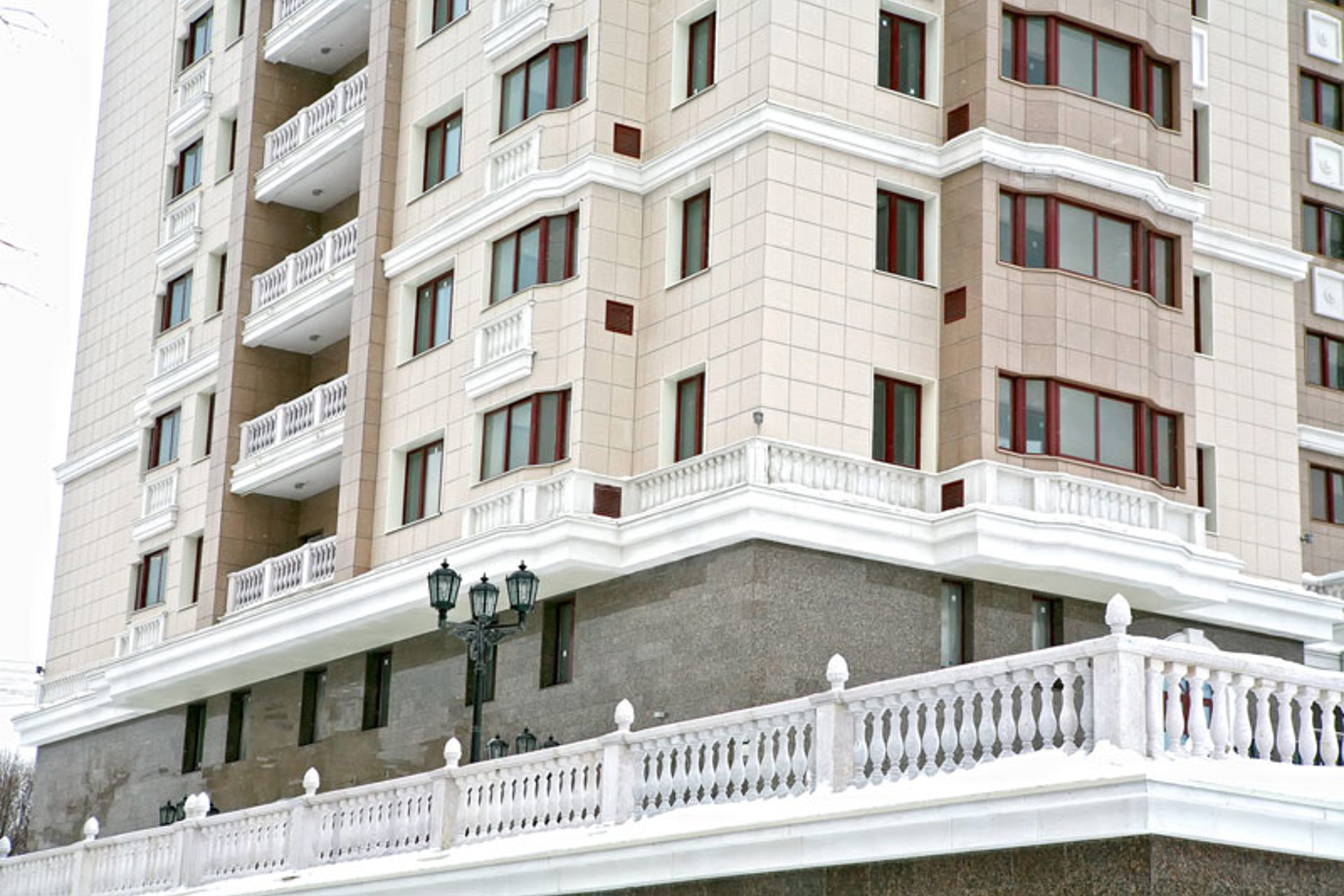 Облицовочный материал: керамогранит (видимое крепление), натуральный камень, декор из стеклофибробетона