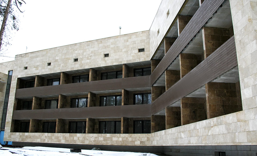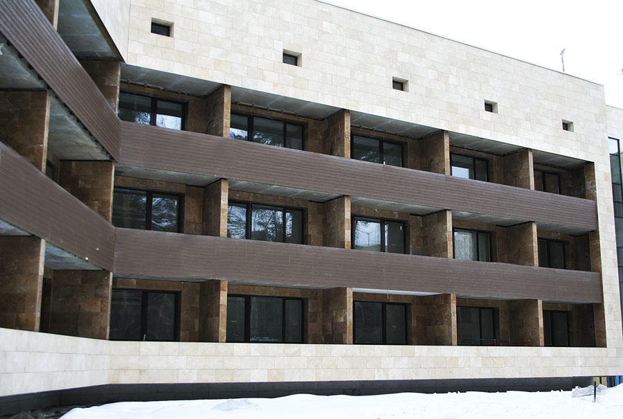 Облицовочный материал: натуральный камень, керамогранит (скрытое крепление), плиты KMEW