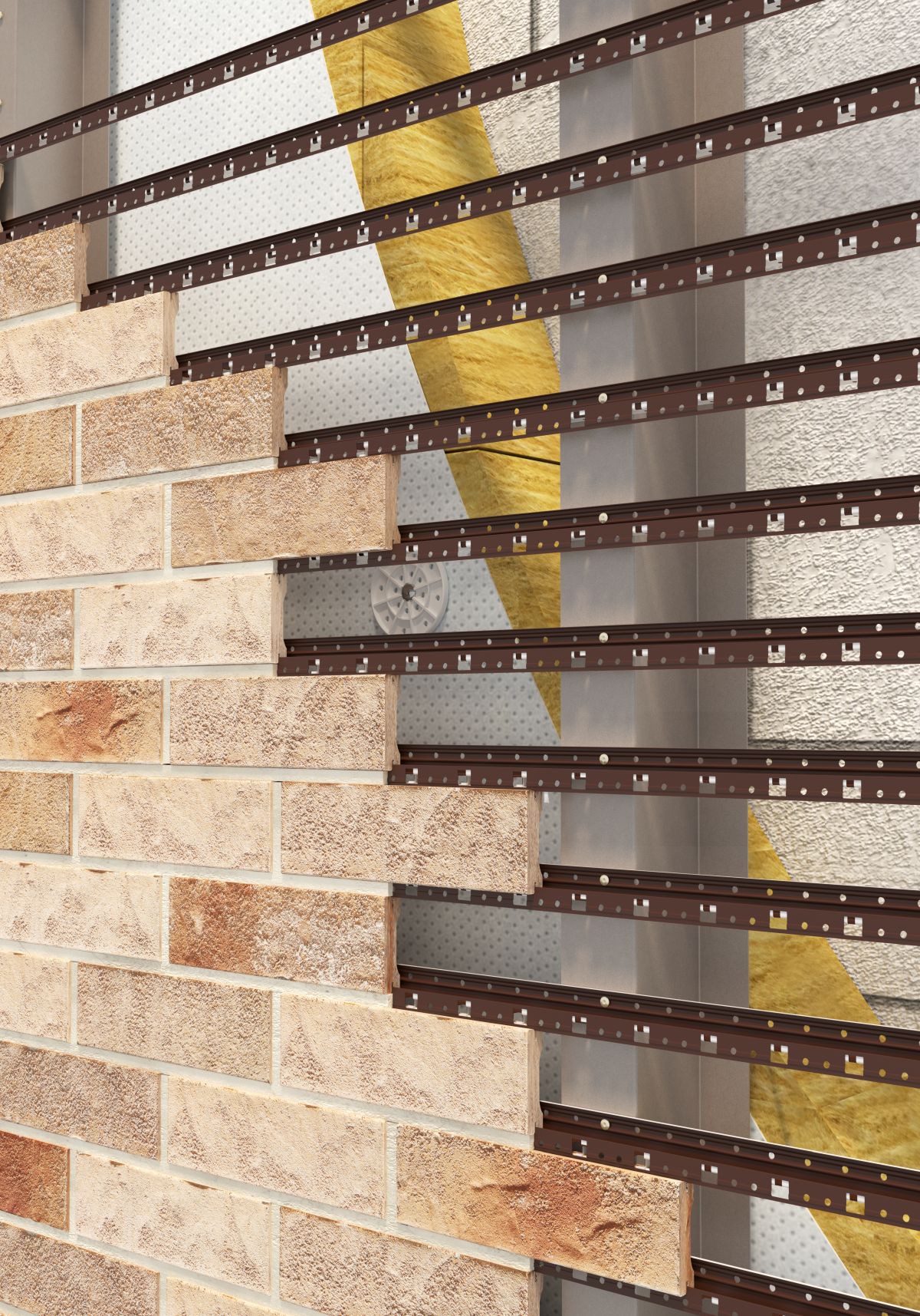 Особая запатентованная форма крепежного профиля позволила отказаться от применения перфоленты в горизонтальных швах — благодаря этому повысилась надёжность системы и уменьшилась трудоемкость монтажа.